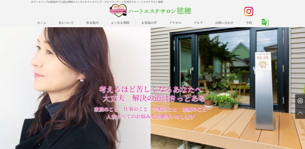 | 料金 | ・一般カウンセリング 50分;1万2,000円 ・一般トラウマケア 50分:1万2,000円 ・お子様向け(18歳未満)カウンセリング 50分:1万2,000円 ・お子様向け(18歳未満)トラウマケア 50分:1万2,000円 ・アスリート向けのカウンセリング 50分:3万円 ・アスリート向けのトラウマケア 50分:3万円 ・アーティスト向けのカウンセリング 50分:3万円 ・アーティスト向けのトラウマケア 50分:3万円 ・経営者向けのカウンセリング 50分:4万5,000円 ・経営者向けのトラウマケア 50分:4万5,000円 ・補助を利用した一般トラウマケア(新潟県内在住者のみ) 50分:無料 ・補助を利用したお子様向けのトラウマケア(新潟県内のみ) 50分:無料 ※出前講座やグループセラピーなども実施しています。 |
