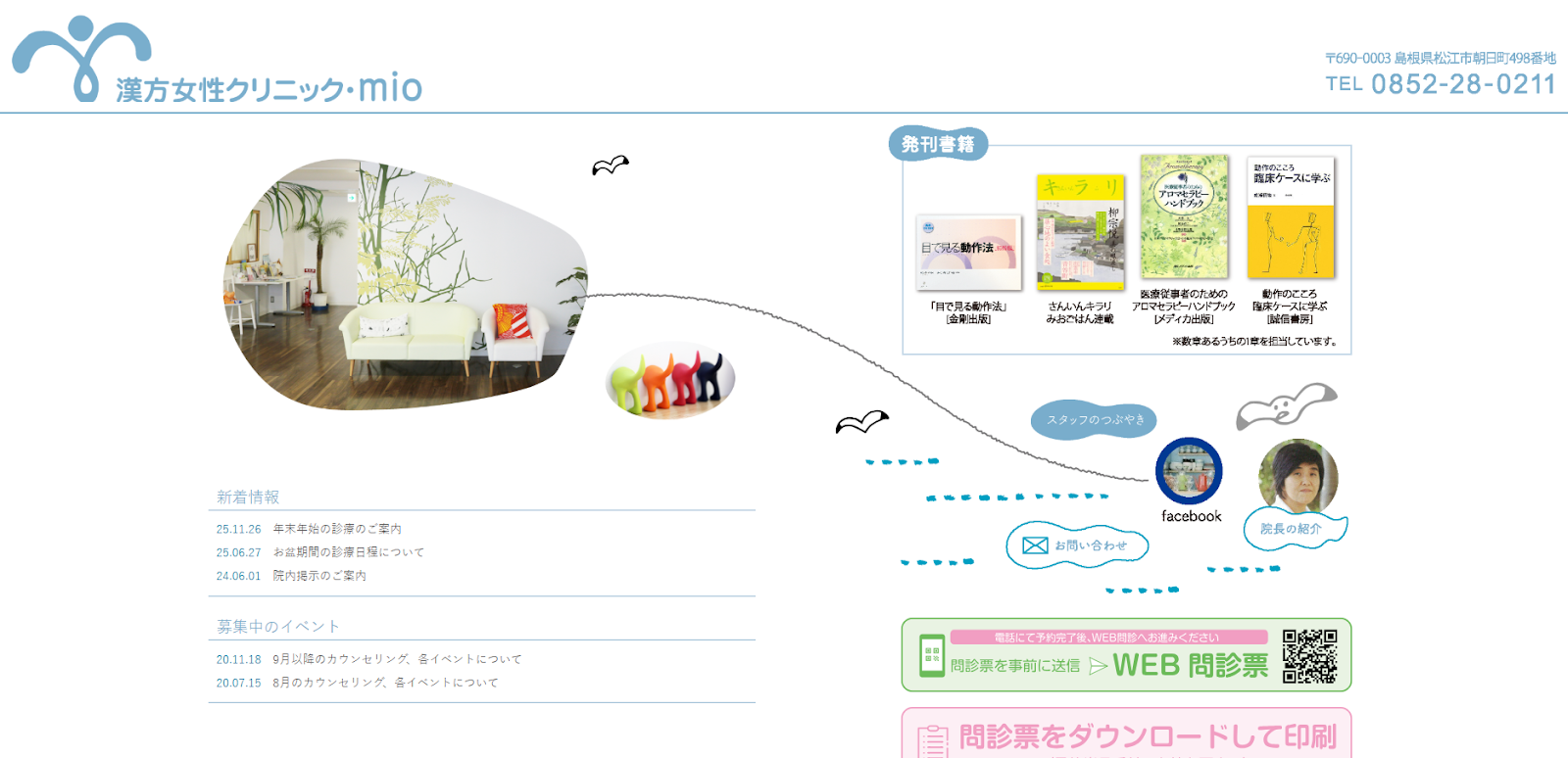 婦人科と心療内科をベースにした、完全予約制のこころとからだのクリニックです。一般的な診察にくわえ、漢方や食養生、カウンセリングで「私(mio)」探しの手伝いをしてくれます。